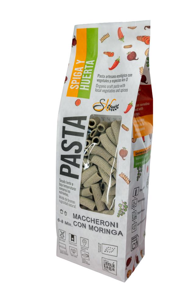 De la fusión de nuestra sémola de trigo duro y la moringa deshidratada surge una pasta con intenso sabor vegetal. Disfruta de las magníficas cualidades nutricionales de la moringa sin renunciar al disfrute de un buen plato de pasta. Los maccheroni de moringa son perfectos para salsas cuyos ingredientes se puedan introducir por el hueco típico del macarrón. Ideales para platos de pasta fría (pruébalos en ensaladas que incluyan frutas, brotes, hojas verdes, aceitunas, flores comestibles, hortalizas o legumbres). Acompáñalas con salteados de verduras de temporada y hongos, queso, etc.